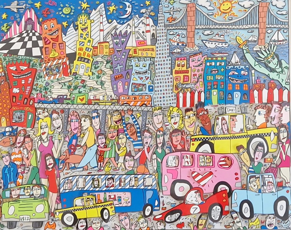 James Rizzi, der legendäre Pop-Art-Künstler aus New York. 1950 in Brooklyn geboren, studierte er bis 1974 Kunst an der University of Florida in Gainesville. Bereits kurz nach Studienende hatte er die Chance, seine Arbeiten im New Yorker Brooklyn Museum zu präsentieren.